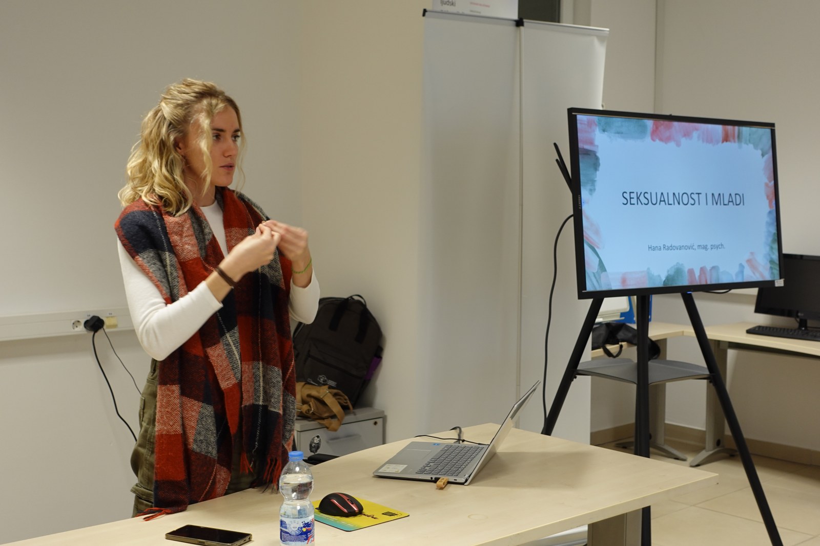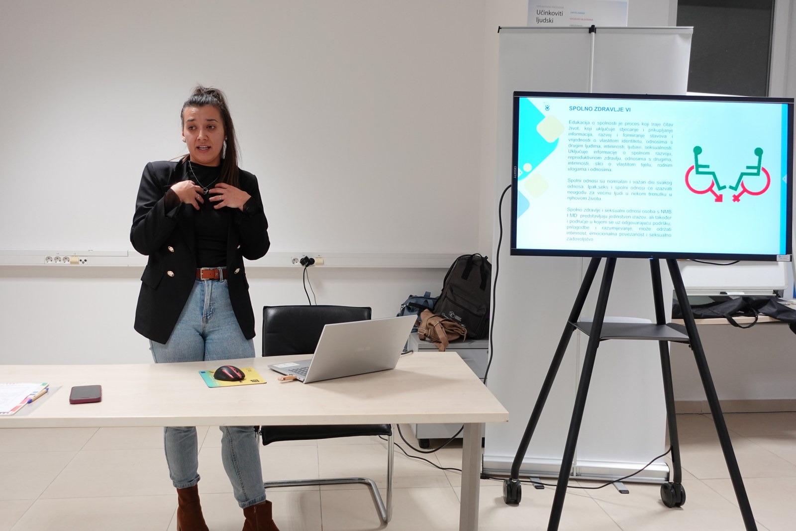 Središnji dio edukacije bilo je izlaganje Hane Radovanović, psihologinje Psihološkog centra Nit, o temi “Seksualnost i mladi” sa stručnim, praktičnim i inspirativnim uvidima u izazove mladih s invaliditetom u području seksualnosti. Edukacija o seksualnosti od ključne je važnosti radi zdravog seksualnog razvoja, stvaranja svijesti o vlastitom tijelu i pravilnog razumijevanja seksualnosti kao prirodne i normalne komponente ljudskog života.Prema Svjetskoj zdravstvenoj organizaciji (WHO) seksualnost je središnji aspekt ljudskog života kroz sve njegove faze, a obuhvaća spol, rodne identitete i uloge, seksualnu orijentaciju, eroticizam, zadovoljstvo, intimnost i reprodukciju. Seksualnost je univerzalna potreba i pravo svakog pojedinca. Kroz interaktivnu prezentaciju, Radovanović se dotaknula niza tema povezanih sa seksualnim pravima, intimnošću, spolnim zdravljem i izazovima s kojima se mladi suočavaju. Prezentacija je ponudila odgovore na često zanemarena pitanja, a kroz konkretne primjere i savjete, sudionicima su pruženi alati za bolje razumijevanje sebe i svojih potreba. Naglasila je kako mladi s neuromuskularnim bolestima često doživljavaju povećan pritisak zbog fizičkih ograničenja, društvenih predrasuda i unutarnjih nesigurnosti. Upravo ta kombinacija može utjecati na njihovo samopouzdanje, tjelesni identitet i sposobnost ostvarivanja emocionalno ispunjavajućih veza. Radovanović je naglasila kako se mladi s mišićnom distrofijom suočavaju s dodatnim preprekama u istraživanju i izražavanju svoje seksualnosti: od stigmatizacije i deseksualizacije gdje društvo često marginalizira seksualnost osoba s invaliditetom stvarajući osjećaj izolacije i nesigurnosti, preko tjelesnih ograničenja i ograničene mobilnosti do nedovoljne, neadekvatne edukacije i pristupa informacijama te nedostatka podrške. Svi navedeni čimbenici mogu dodatno otežati stvaranje zdravih partnerskih odnosa.