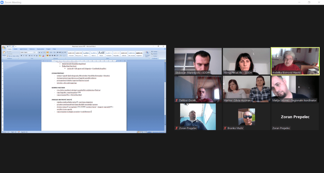 Na radionicama su sudionici posebno naglasili pitanje pristupačnosti javnih institucija, poput pošte, Općinskog suda, kina, , ali i neprilagođenost prometnica poglavito u vidu nespuštenih rubnjaka na pješačkim prijelazima te uskih i oštećenih nogostupa što otežava kretanje mjestom te ga čini čak i opasnim za osobe u invalidskim kolicima. Nadalje su naveli nepostojanje javnog gradskog prijevoza ili kombija prilagođenog osobama s invaliditetom, a upravo nepostojanje javnog prilagođenog prijevoza za osobe s invaliditetom u Virovitičko-podravskoj županiji su osobe s MD istakle kao gorući problem za njih. Većina sudionika radionice živi na selima ili periferiji grada i svaki odlazak u grad, bilo do liječnika ili zbog nekog drugog razloga, moraju se „snaći za prijevoz“ ili ga platiti što čini dodatni financijski trošak invaliditeta. Sve to otežava svakodnevnicu te su prisiljeni moliti i čekati da ih netko odveze. Uz ovo, osobe s područja Požeško-slavonske županije navele su i da im teškoće predstavlja i nedostatak WC-a prilagođenih za osobe s invaliditetom u raznim institucijama, ali i u uslužnim djelatnostima što se negativno odražava na njihov društveni život, mogućnost izlazaka i slično, te su posebno naznačili potrebu za kontinuiranim informiranjem zdravstvenih djelatnika o MD i NMB s obzirom na to da se i dalje često suočavaju s nepoznavanjem oboljenja od strane istih.