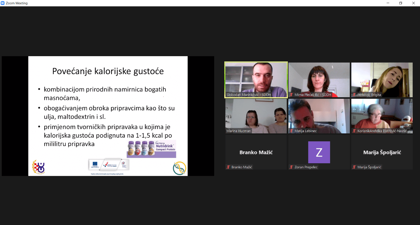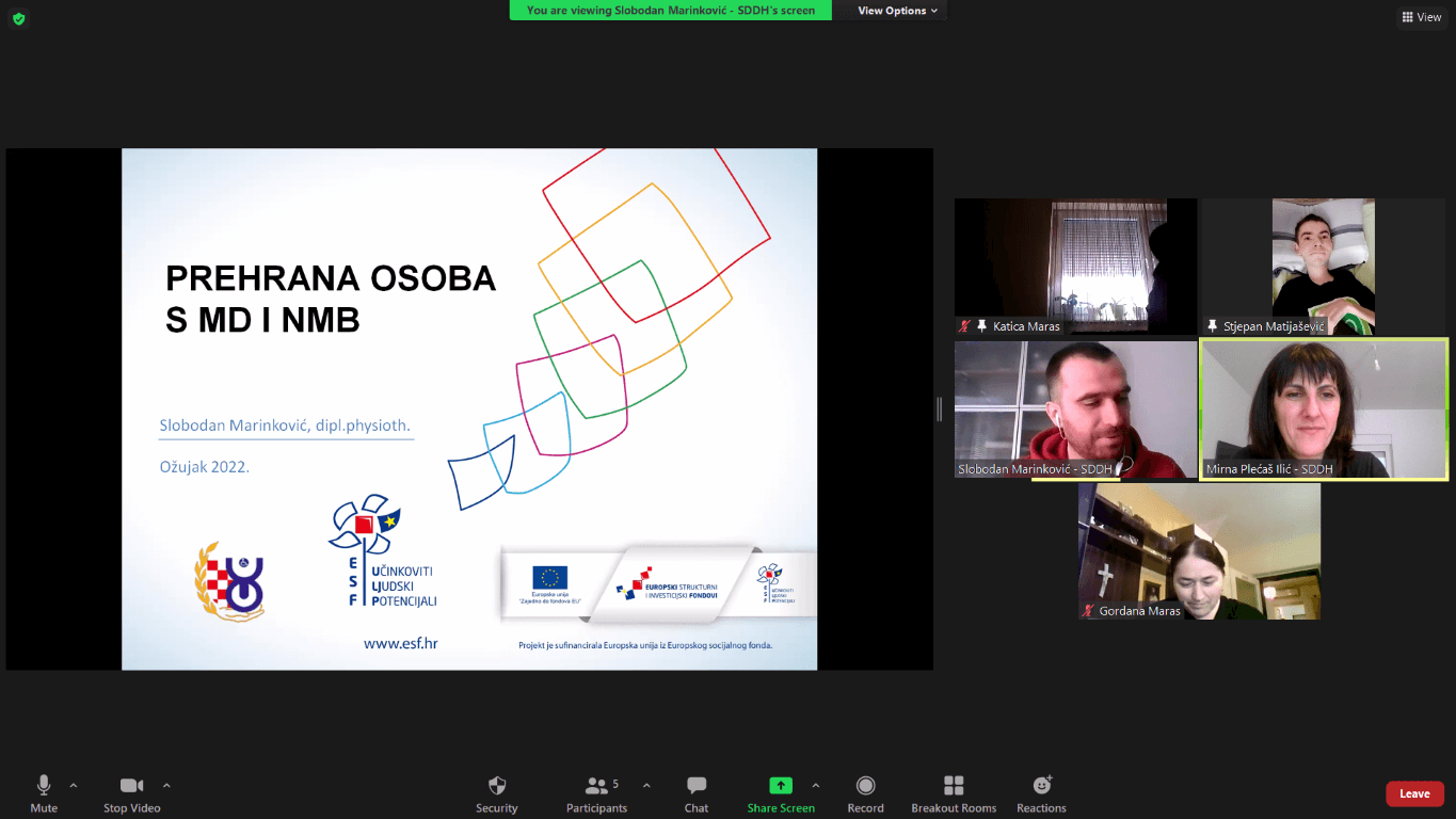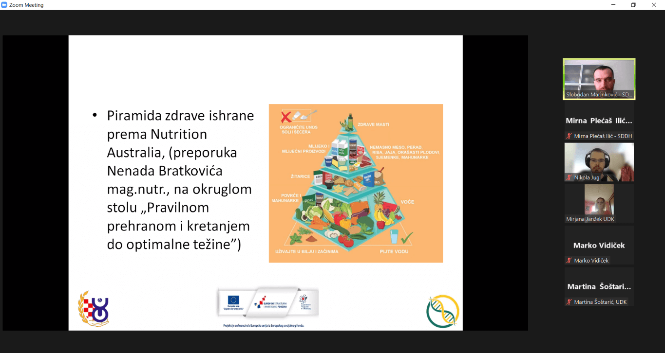 Slobodan Marinković, fizioterapeut SDDH i voditelj Projekta, govorio je o prehrani kao alatu koji, ako se pravilno koristi, osigurava optimalan unos hranjivih tvari što prehranu čini neophodnom za očuvanje zdravlja i uredne funkcije svih organa I time posebno bitnom za osobe s MD. Tijekom radionice razgovaralo se o tomu kako su se preporuke zdrave prehrane mijenjale tijekom godina te je sudionicima preporučeno hranjenje prema piramidi zdrave prehrane Nutrition Australia koju, za osobe smanjene pokretljivosti preporučuje i magistar nutricije Nenad Bratković zbog toga što, uz adekvatan unos hranjivih sastojaka, vlakana i kombinacije biljnih i životinjskih proteina, ističe značaj optimalnog unosa vode i soli. Nadalje su istaknute teškoće i glavni čimbenici neadekvatne prehrane kod osoba s MD kod kojih je specifično da, uslijed nemogućnosti samostalnog hranjenja i otežanog žvakanja i gutanja istovremeno mogu biti pothranjeni, ali i pretili zbog smanjene potrošnje energetskog i kalorijskog unosa uzrokovano smanjenim kretanjem. Posebno su naglašene važnost tzv. zgušnjavanja hrane radi većeg hranjivog unosa u manjim količinama, zatim činjenica da zbog prirode MD kao bolesti kod većine oblika nije moguće povećati mišićnu masu povećanim unosom bjelančevina što se često pokušava, a može se negativno odraziti na opće zdravstveno stanje jer organizam nije u mogućnosti procesirati višak bjelančevina što ga dodatno opterećuje te značaj pažljivog unosa ugljikohidrata kod osoba s težim respiratornim statusom jer takva prehrana povećava stvaranje ugljičnog dioksida u krvi.