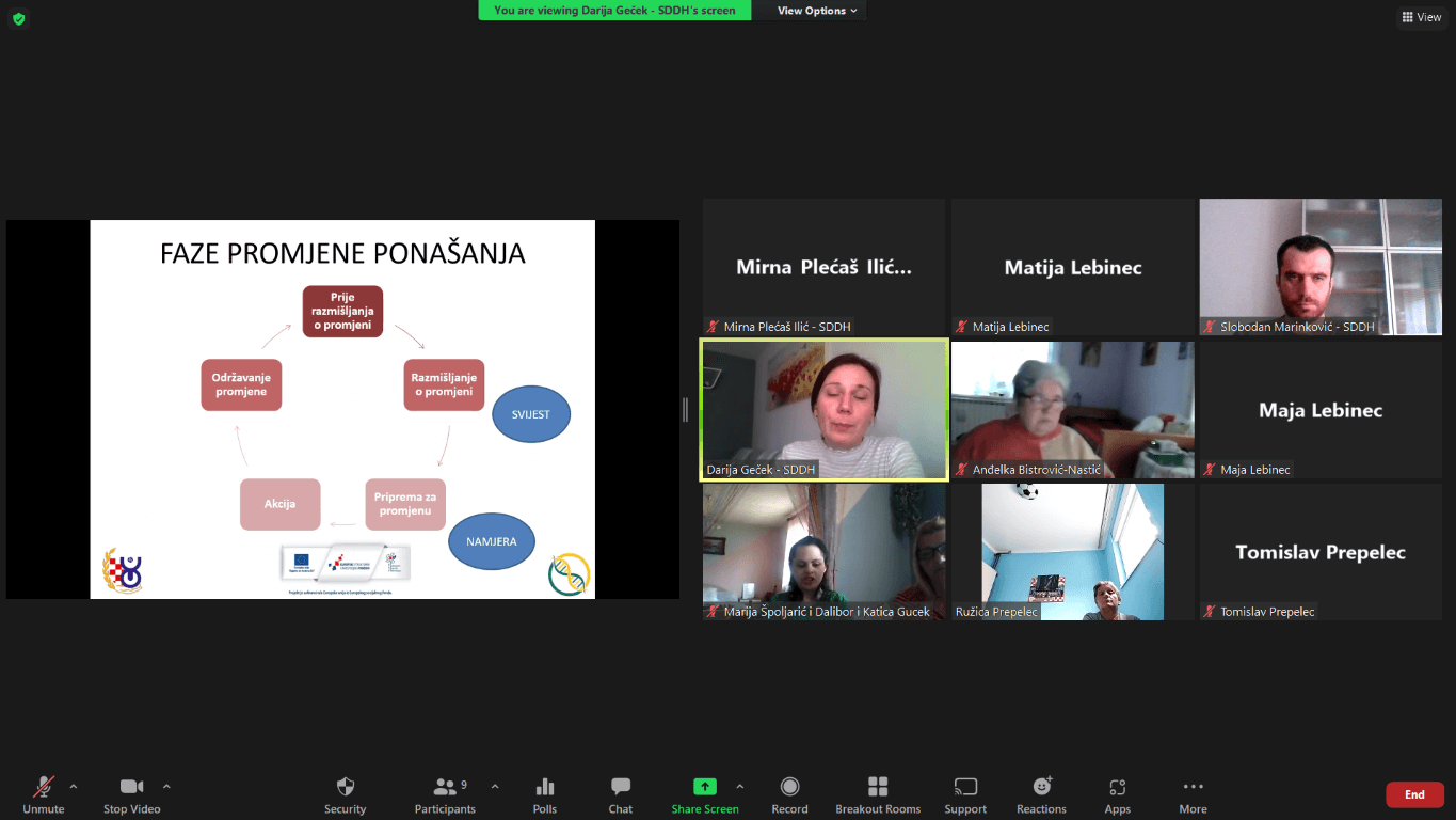 Na radionicama je Darija Geček, socijalna radnica u stručnom timu SDDH predstavila dvije teme. U prvoj temi “Individualni plan promjene pojedinca i obitelji” objasnila je što je to individualni plan procjene, naglasila je da je njegova svrha prevladavanje životnih okolnosti i pojasnila je kada se u socijalnom sustavu radi individualni plan procjene. Govorila je i što individualni plan procjene sadrži i koje su njegove vrste. U drugoj temi “Kako se motivirati na promjenu ponašanja?” govorila je što je promjena, što može biti promjena i objasnila je kako je motivacija važan dio promjene te koja su četiri profila osoba u procesu promjene. Kroz raspravu su sudionici iznosili svoja osobna iskustva nošenja sa životnim promjena koje su im se događale zbog progresije bolesti kod člana obitelji, ali i u životu općenito te kako se na te promjene prilagođavaju. Uz to, pojedini sudionici su se otvorili po pitanju toga što bi oni najviše htjeli promijeniti u životu i kolika im je motivacija, odnosno želja za promjenom.