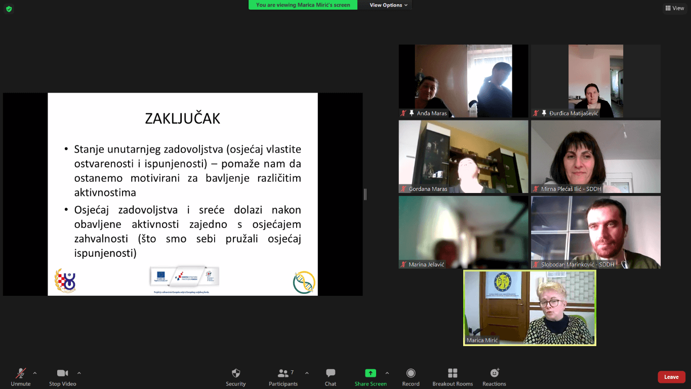 Radionice su provedene putem Zoom platforme. Na radionici za članove obitelji osoba s MD i NMB s područja Požeško-slavonske županije sudjelovalo je troje, Virovitičko-podravske osmoro, Osječko-baranjske dvoje te Krapinsko-zagorske četvoro članova obitelji osoba s MD i NMB.