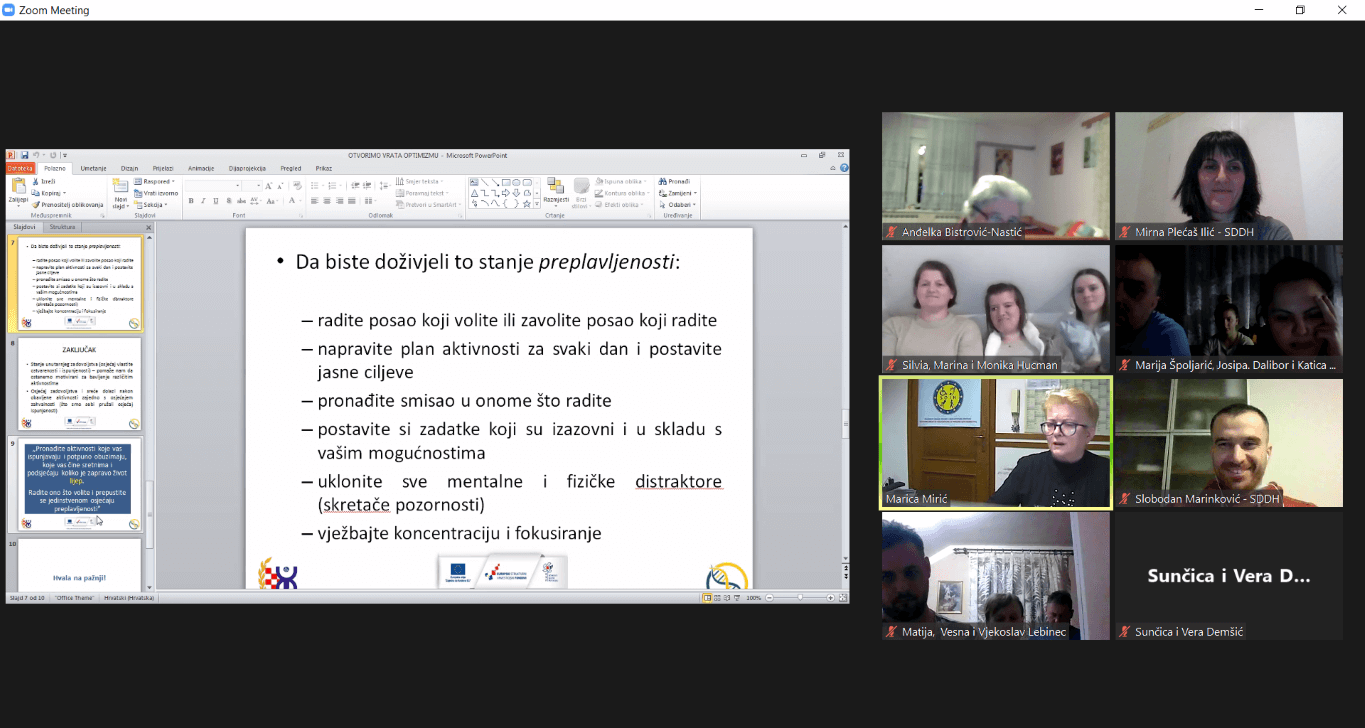 Radionice za članove obitelji osoba s MD i NMB koje se u okviru ESF projekta “Rijetke bolesti – čvrsta mreža podrške” održavaju u Požeško-slavonskoj, Krapinsko-zagorskoj, Virovitičko-podravskoj i Osječko-baranjskoj županiji su u razdoblju od 1. do 4. ožujka provedene na teme mentalnog zdravlja, povezanosti pandemije COVID-19 i mentalnog zdravlja te psihološkog imuniteta i značaja optimizma i pozitivnog životnog stava na svakodnevno življenje.