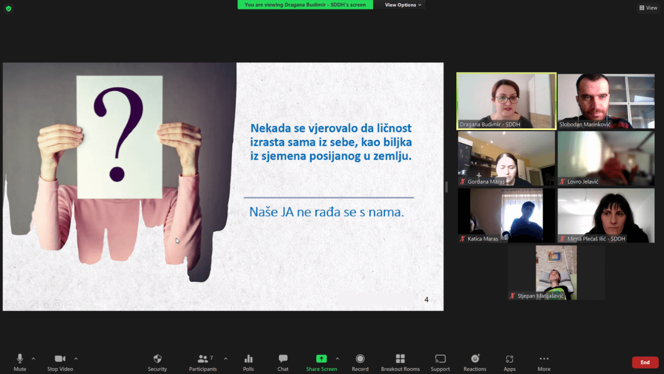 Radionice su provodili Dragana Budimir, psihologinja SDDH, i Mirna Plećaš Ilić, socijalna radnica, koje su tijekom radionica isticale kako se identitet i naša osobnost razvija i mijenja tijekom čitavog života. On je uvjetovan genetskim i biološkim faktorima, ali ovisi i od međuodnosa s drugim ljudima, događaja koje svakodnevno proživljavamo te društva u kojemu se krećemo i boravimo. Sudionici su potaknuti na razmišljanje i razgovor o tomu tko su i kakvi su, što mogu, znaju, vole ili ne vole, ali i o tomu kako ih drugi doživljavaju i opisuju. Vježbe su za cilj imale osvijestiti osobe s MD o tomu je li njihov unutarnji identitet u skladu s onim što pokazuju u svakodnevnom životu jer je upravo otkrivanje onoga što želimo i življenje u skladu s tim unutarnjim osjećajima preduvjet za opće životno zadovoljstvo.