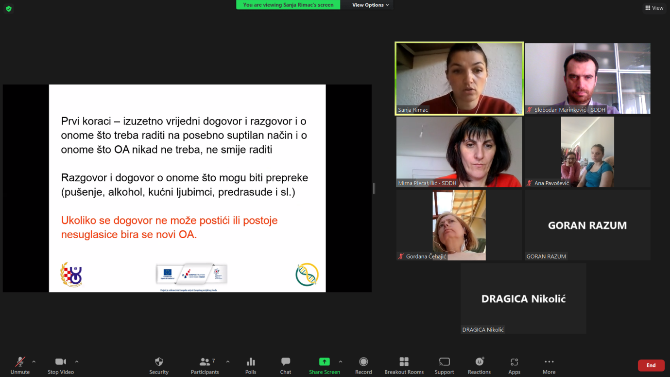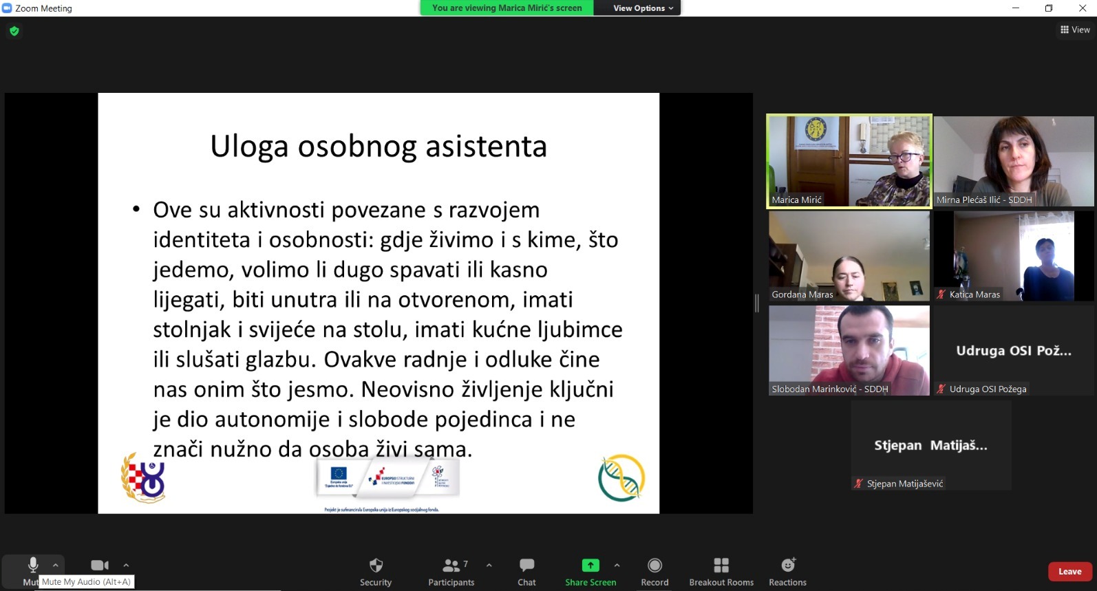 Tijekom radionica, koje su provodile Marica Mirić, predsjednica SDDH, odnosno Sanja Rimac, socijalna radnica i izvršna direktorica SDDH, sudionicima, među kojima je bilo već postojećih korisnika osobne asistencije, ali osoba koje uslugu još uvijek nisu koristile, no zbog progresivne prirode MD kao bolesti može se očekivati da će u budućnosti na isto biti prinuđeni, je dodatno pojašnjena uloga osobnog asistenta, a prvenstveno uloga osoba s MD kao korisnika usluge osobne asistencije. Kroz radionice je predstavljena uloga udruge u zapošljavanju i kontroli rada osobnoga asistenta kao i odnosa između asistenta i korisnika, osobama s MD su pruženi savjeti kako uspostaviti i održati kvalitetan poslovni odnos s osobnim asistentom te koje su posebno važne stvari koje je potrebno dogovoriti prije samog početka suradnje. Radionice su održane po završetku radionica za članove obitelji, a provođene putem Zoom platforme za osobe s MD i NMB u: