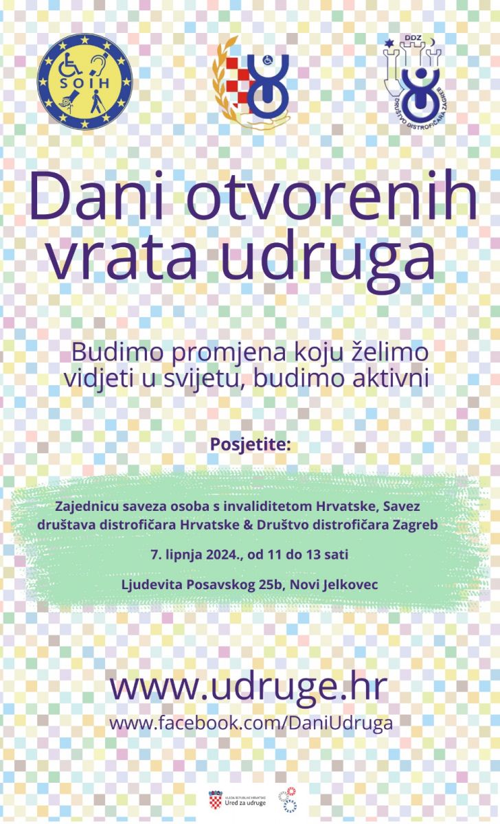 Savez društava distrofičara Hrvatske (SDDH) u suradnji sa Zajednicom saveza osoba s invaliditetom Hrvatske (SOIH) i Društvom distrofičara Zagreb (DDZ) uključuje se u manifestacijiu Dani otvorenih vrata udruga 2024. koju organizira Ured za udruge, a aktivnosti će se održati u petak, 7. lipnja 2024., od 11 do 13 sati u prostorijama DDZ-a, Ljudevita Posavskog 25b, Novi Jelkovec. Dan otvorenih vrata savršena je prilika da se međusobno bolje upoznamo, razmijenimo iskustva i informiramo jedni druge o planovima za naredno razdoblje. Cilj je informiranje javnosti o našem radu u lokalnoj i široj zajednici te prilika građanima za upoznavanje s različitim društveno korisnim projektima i programima udruga, ali i mogućnostima volontiranja u udrugama. Želimo povećati vidljivost djelovanja te poboljšati percepciju udruga u javnosti. Pridružite nam se u Novom Jelkovcu! Upoznajte nas!